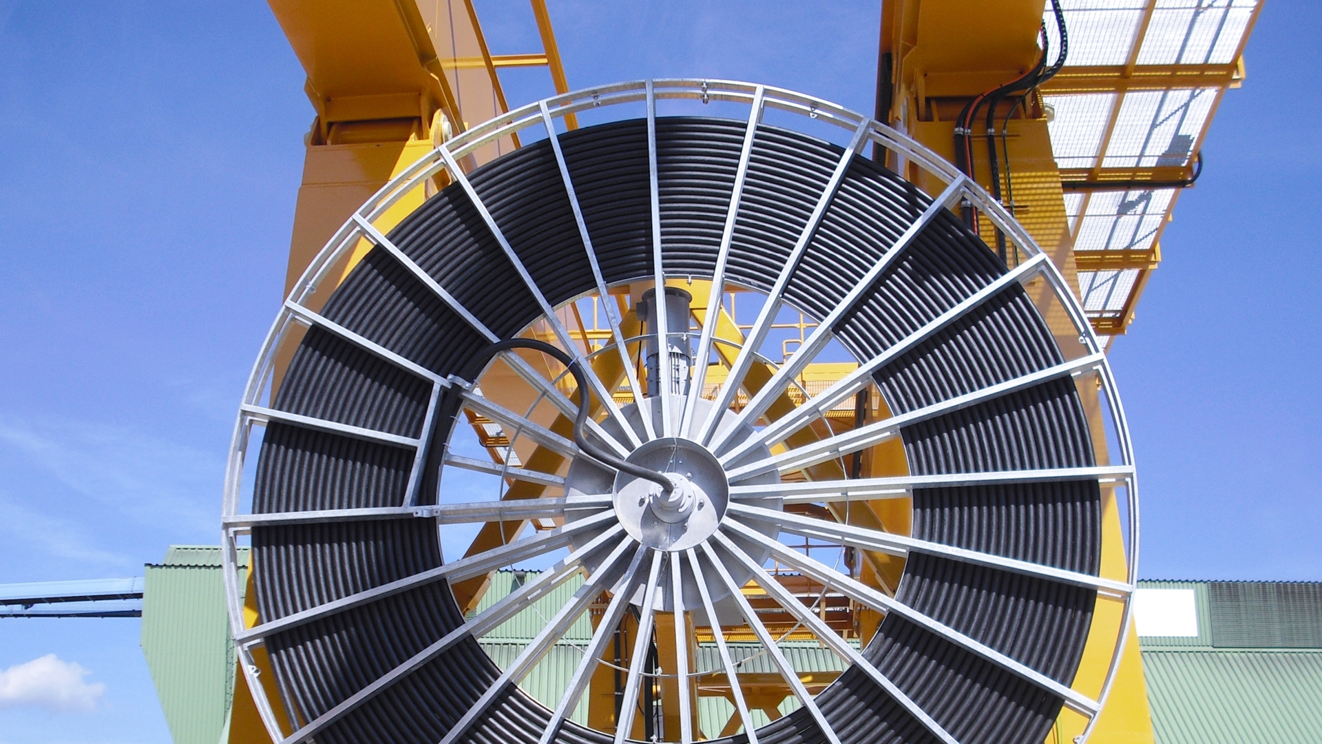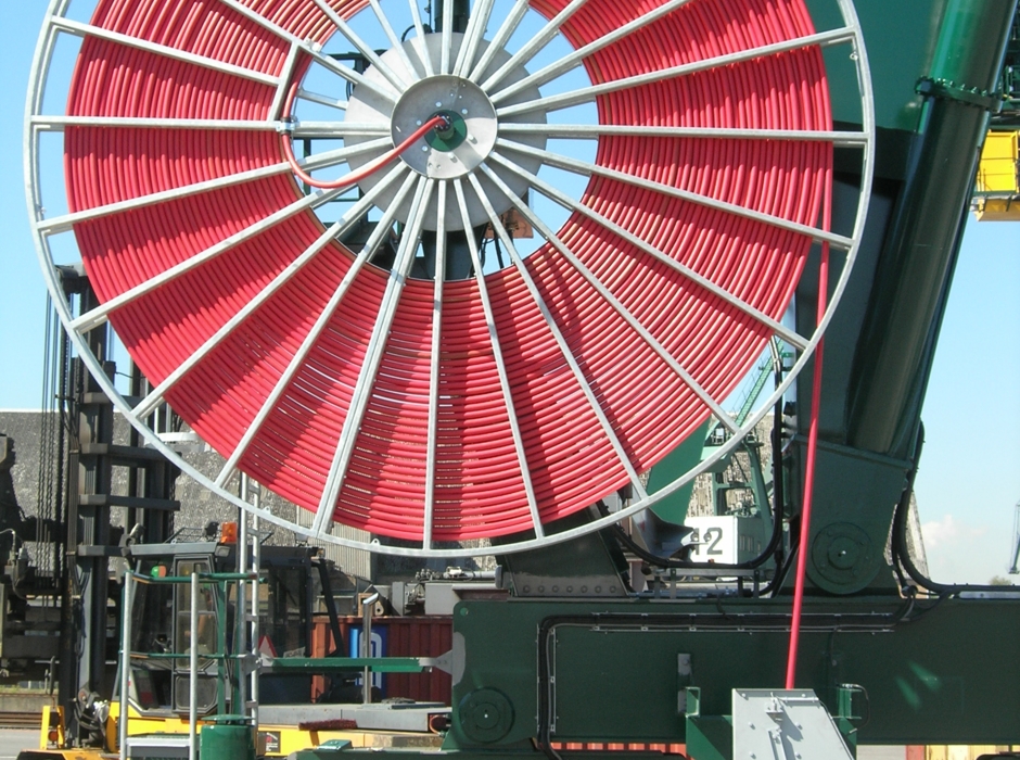 Motorleitungstrommeln sind technologisch ausgereifte und qualitativ hochwertige Übertragungssysteme für Energie, Steuersignale und Daten für mobile Verbraucher. Sie sind die ideale technische Lösung für die zuverlässige Energieversorgung von Schiffs- und Baukranen, Maschinen für den Materialumschlag, Baufahrzeugen, Verschiebewagen oder Lokomotiven in der innerbetrieblichen Logistik.